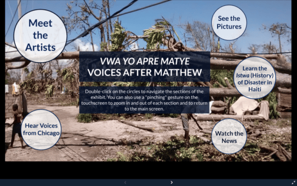 In the spring quarter of 2017, we took Leora Auslander and Lindsey Martin’s Broadening Horizons course at the University of Chicago, part of the Making History Work pilot program for the AHA–Mellon Career Diversity for Historians initiative. As an element of the course, we collaborated with Hernandez to curate an interactive oral history and visual art exhibit at HAMOC. The exhibit, Vwa Yo Apre Matye – Voices after Matthew, recalled the response to and recovery from Hurricane Matthew, which devastated Haiti in October 2016. The experience made us aware of the power of narrative, our passion for telling compelling stories, and our role as historians in engaging and challenging popular histories.