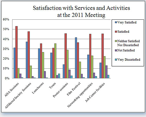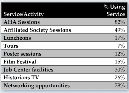 Judging from the open comments, these were often older attendees who felt their particular areas of interest (e.g., military, diplomatic, premodern) were underrepresented in sessions at the meeting or that topics they did not care for (e.g., “politically correct history”) were overrepresented. And where 70 percent of the one-time attendees expressed satisfaction about the Job Center, only 58 percent of the regular attendees shared their sentiments.