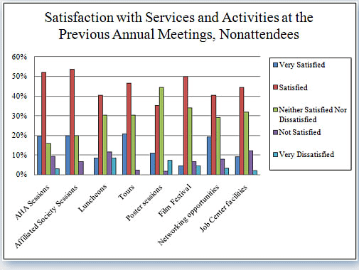 When crosstabulated by the number of meetings attended, the responses from nonattendees differed sharply from the responses of those who did attend this year. Respondents who had attended at least five meetings but skipped this year’s meeting were the most negative about various aspects of the annual conference. While 82 percent of those who had attended the meeting only once were satisfied with the AHA sessions, for instance, only 70 percent of those who had attended five meetings or more expressed similar satisfaction.