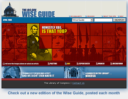 Visit the Wise Guide’s archives to explore past months’ features. For instance, learn about the Conquest of Mexico and the LOC’s “Exploring the Early Americas,” in the January 2008 guide. Check out the November 2007 guide for a feature on Lewis and Clark. Or, find links to a webcast about the history of the American flag from the guide in June of 2007.