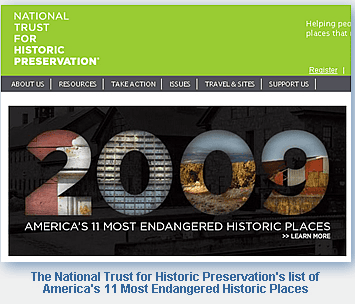 The National Trust for Historic Preservation announced this week its 2009 list of the America’s 11 Most Endangered Historic Places. The NTHP began compiling these lists in 1988; making this year the 22nd time they have done so. The awareness raised by these lists has saved dozens of sites, and elevated many to “favorable” rather than “endangered” status.