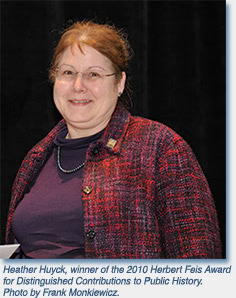 For exemplary contributions to public history as National Park Service historian, planner, and legislative specialist; as facilitator of strengthened collaboration between public and academic historians; as leading advocate for the interpretation of women’s history at public sites; and as teacher and mentor of future historians, the Association is pleased to present the 2010 Feis Award to Heather Huyck, College of William and Mary.
