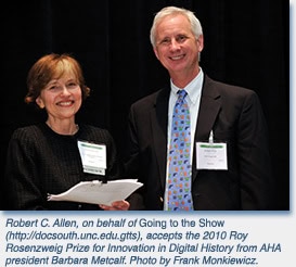 The 2010 Roy Rosenzweig Prize was awarded to Going to the Show, https://docsouth.unc.edu/gtts; Scholarly Advisor: Robert C. Allen, University of North Carolina at Chapel Hill; Principal Investigator: Natasha Smith; Project Managers: Elise Moore (2008–09) and Adrienne MacKay (2007–08).