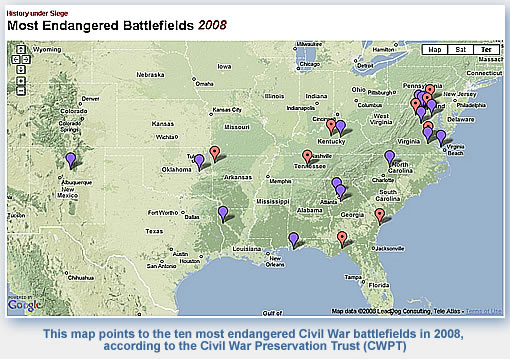 The 2008 edition of History Under Siege: America’s Most Endangered Battlefields lists ten battlefield sites, including Antietam, Maryland; Perryville, Kentucky; and Cold Harbor, Virginia, that are threatened by housing development, highway construction, and the construction of cell phone towers and industrial facilities. Sites in areas that were once rural are under increasing pressure from suburban and exurban development. A map shows the distribution of the threatened sites. Nominations are submitted by members and reviewed by a board of historians and preservationists. Sites are selected based on geographic location, military significance, and preservation status. The Civil War Preservation Trust, with 65,000 members, is the largest nonprofit organization dedicated to the preservation of Civil War battlefields.