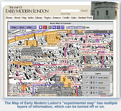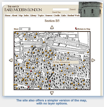 The Map of Early Modern London site is like Google Maps for Shakespeare’s time. But instead incorporating traffic patterns, restaurants, and shortest routes, this experimental map shows wards, churches, and livery companies. Locations on the map are linked articles, or related information. And for visitors who find the layered experimental map too daunting, there is the simpler original Agas Map, which can be zoomed in on and has locations to click on, but doesn’t offer the many features of the experimental version.