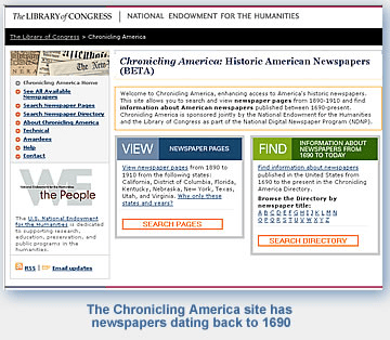 In “First Drafts of History at Your Fingertips,” Pillarisetti Sudhir profiled the Chronicling America site, a digital project of the National Endowment for the Humanities and the Library of Congress. The Chronicling America site currently provides access to over 200,000 pages of newspapers (dating back to 1690) from six states and the District of Columbia.