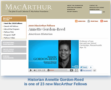 The John D. and Catherine T. MacArthur Foundation named 23 new MacArthur Fellows for 2010 on September 28th. Among the winners of these “genius grants” was historian and AHA member Annette Gordon-Reed, who also won the Pulitzer Prize and received a Guggenheim fellowship in 2009. Gordon-Reed has authored definitive works on the relationship between President Thomas Jefferson and Sally Hemings. She is on the faculty of Harvard Law School, with joint appointments as Professor of History in the Faculty of Arts and Sciences and Carol K. Pforzheimer Professor at the Radcliffe Institute for Advanced Study. You can see a video interview and description of her research on the MacArthur Foundation web site.