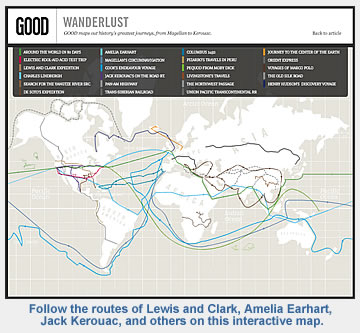 The Wanderlust site, from GOOD magazine, “maps out history’s greatest journeys, from Magellan to Kerouac,” and incorporates images and more information. Follow the route of the Pequod (from Moby-Dick), travel across North America with Lewis and Clark, or discover the old Silk Road.