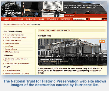 The National Trust for Historic Preservation has posted reports on the impact of Hurricanes Ike and Gustav on historic buildings in the affected areas, including several National Trust properties. On September 17, representatives of the Galveston Historical Foundation received permission from authorities to visit Galveston Island to assess the damage. They report that the Strand National Historic Landmark District and East End residential district sustained serious flood damage. The Trust is seeking volunteer structural engineers and architects to work with the Galveston Historical Foundation, Preservation Texas, and preservation groups to assess affected properties and work to save as many as possible.