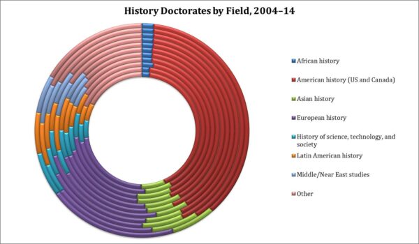 The complexity of our discipline, however, makes analysis difficult. The survey breaks down history into a very limited array of subfields that for the most part follow traditional geographical divisions. In reality, however, dissertations in a range of different fields cover historical topics. Furthermore, while the survey lists history as part of the humanities, “area/ethnic/cultural studies” is categorized under social sciences. The humanities also encompass “American/US studies” and “Jewish/Judaic studies and history,” both of which are home to historians but listed separately on the survey. PhDs in these areas contribute to historical knowledge in the United States and other parts of the world.