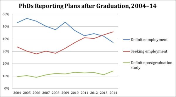 Figure 3: Reported plans of new history PhDs following graduation, 2004–14.