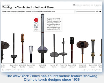 The New York Times has created an interesting interactive page of Olympic torch designs from 1936-2008, which we mentioned in our most recent edition of “What We’re Reading.” - ESPN