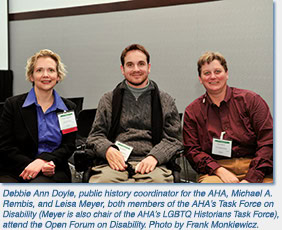 Both the Open Forum on Disability and the LGBTQ Historians Task Force Open Forum included a discussion on how to effectively address equity issues within the existing structure of the Association. Leisa Meyer (Coll. of William & Mary), who serves on both task forces, pointed out that these questions touch on larger issues relating to the multiple vectors of discrimination.
